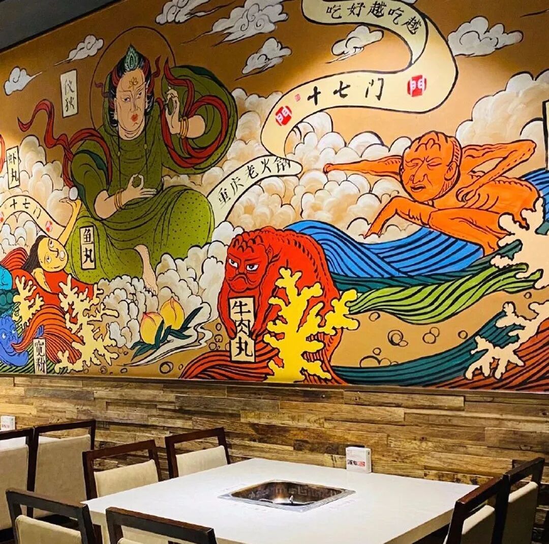 渗透式广告,可以做到趣中带销,无孔不入。比如有些店铺就把乡镇刷在墙上的广告,应用到店面的墙上,通过有特色的壁画把店铺的菜单、招牌菜等元素融入进去,让顾客在菜单认知上,更加有趣。24小时免费、不停歇的广告位,就是门店的的卷闸门,比如下图的蜜雪冰城,即便闭店,过路的人也能记住它门口的雪人。实体店可以借鉴这种方法,也可以通过门口摆放店铺标志物等形式来吸引路人眼球。