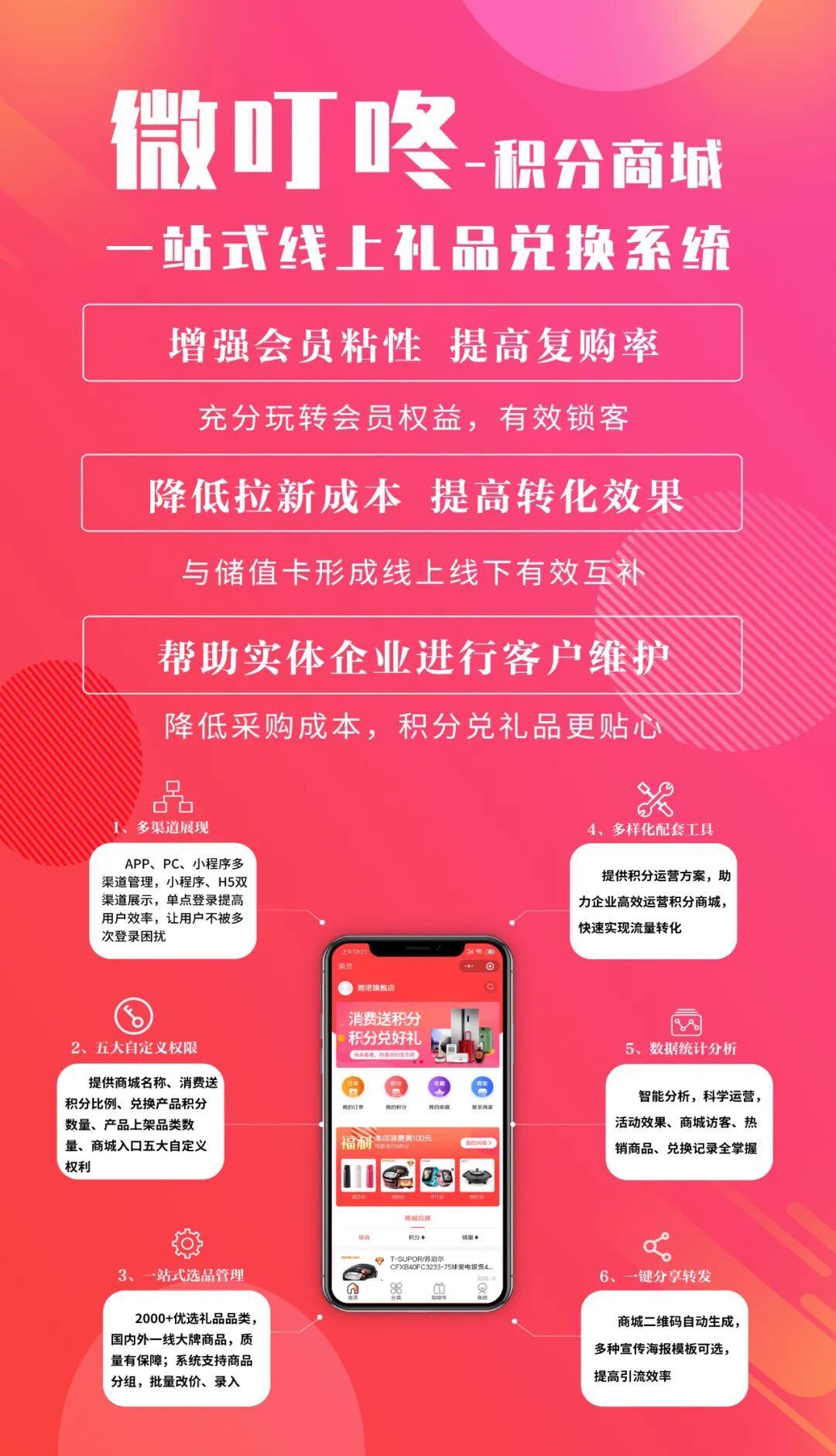 微叮咚积分商城,专注打造实体商家营销锁客平台,赋予商家五大自定义权利——商城名称自定义、消费送积分比例自定义、兑换产品积分数量自定义、产品上架品类数量自定义、商城入口自定义,满足商家个性化积分商城的需求。