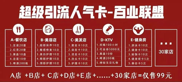 这样由多个商家组成一个附加值超多的“超级联盟卡”,大家共同去销售,任何一个店家卖出去,都可以留下50元的佣金。作为盟主,可以抽取剩余的49元,一家店贡献200张卡,是9800元,10家店,即可盈利98000元。